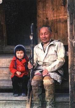 Бурят с ребёнком на пороге дома. Улан-Удэ.
