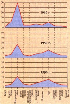 Изменение доли разных регионов в промышленности России (по числу работников, %).