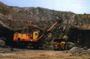 Погрузка железной руды на грузовики Белазы.