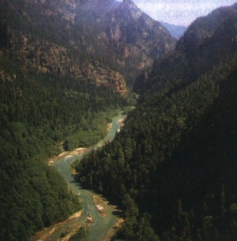 Долина горной реки, прорывающейся через отроги Большого Кавказа.