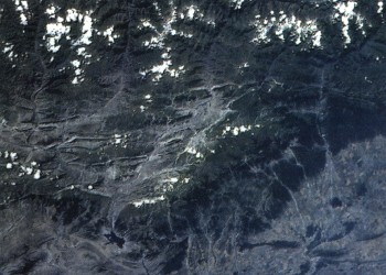 Большой Кавказ и предкавказские равнины в районе Дагестана, Чечни и Ингушетии. Вид из космоса.