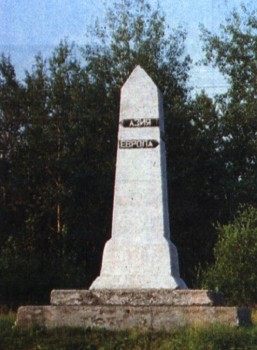 Стела Азия — Европа, обозначающая границу между частями света. Средний Урал.