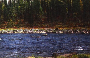Река Аягли на северо-западе Эвенкии. По дальнему берегу идёт медведь.